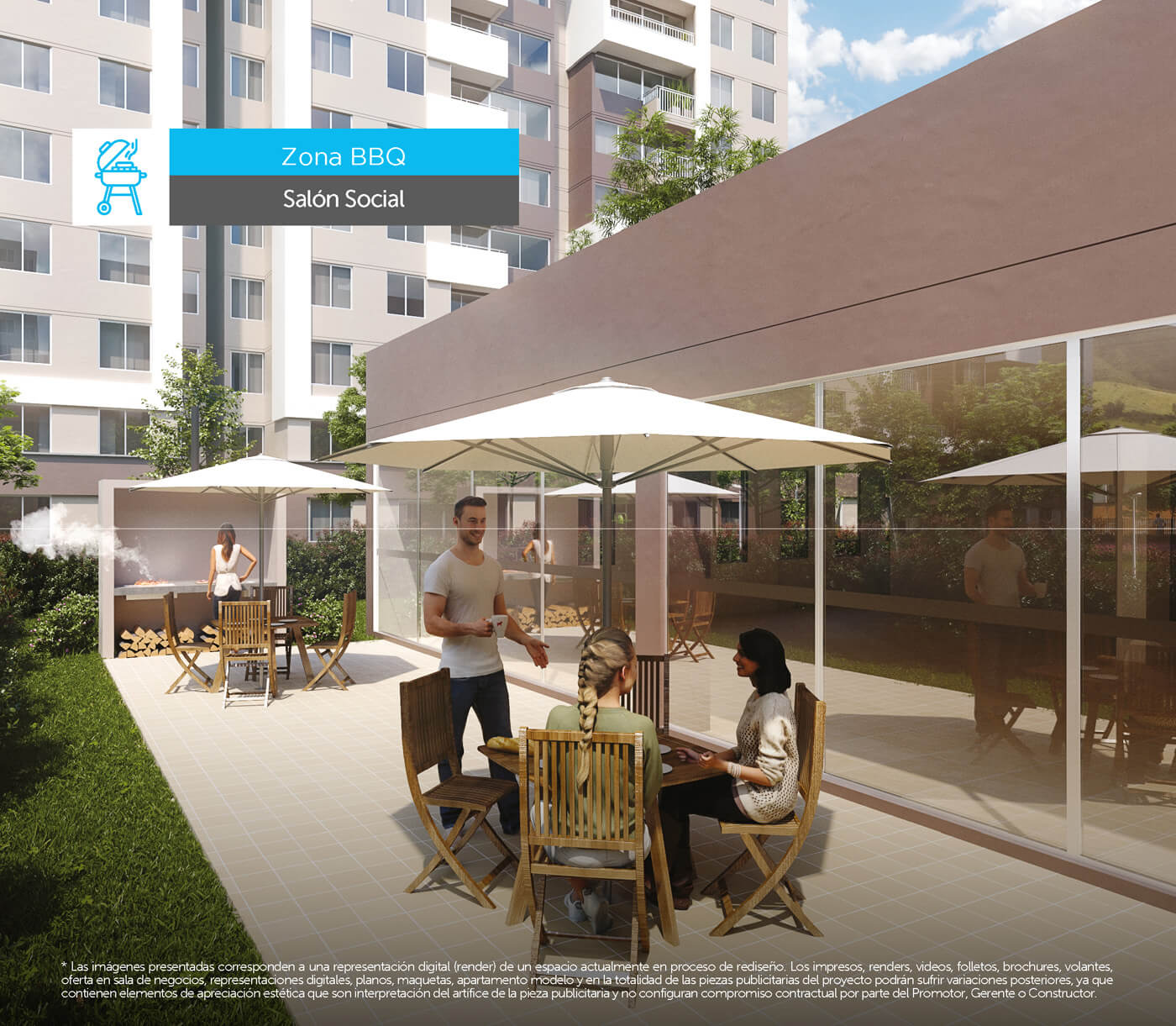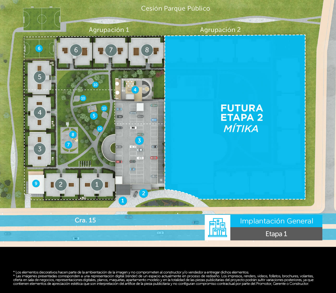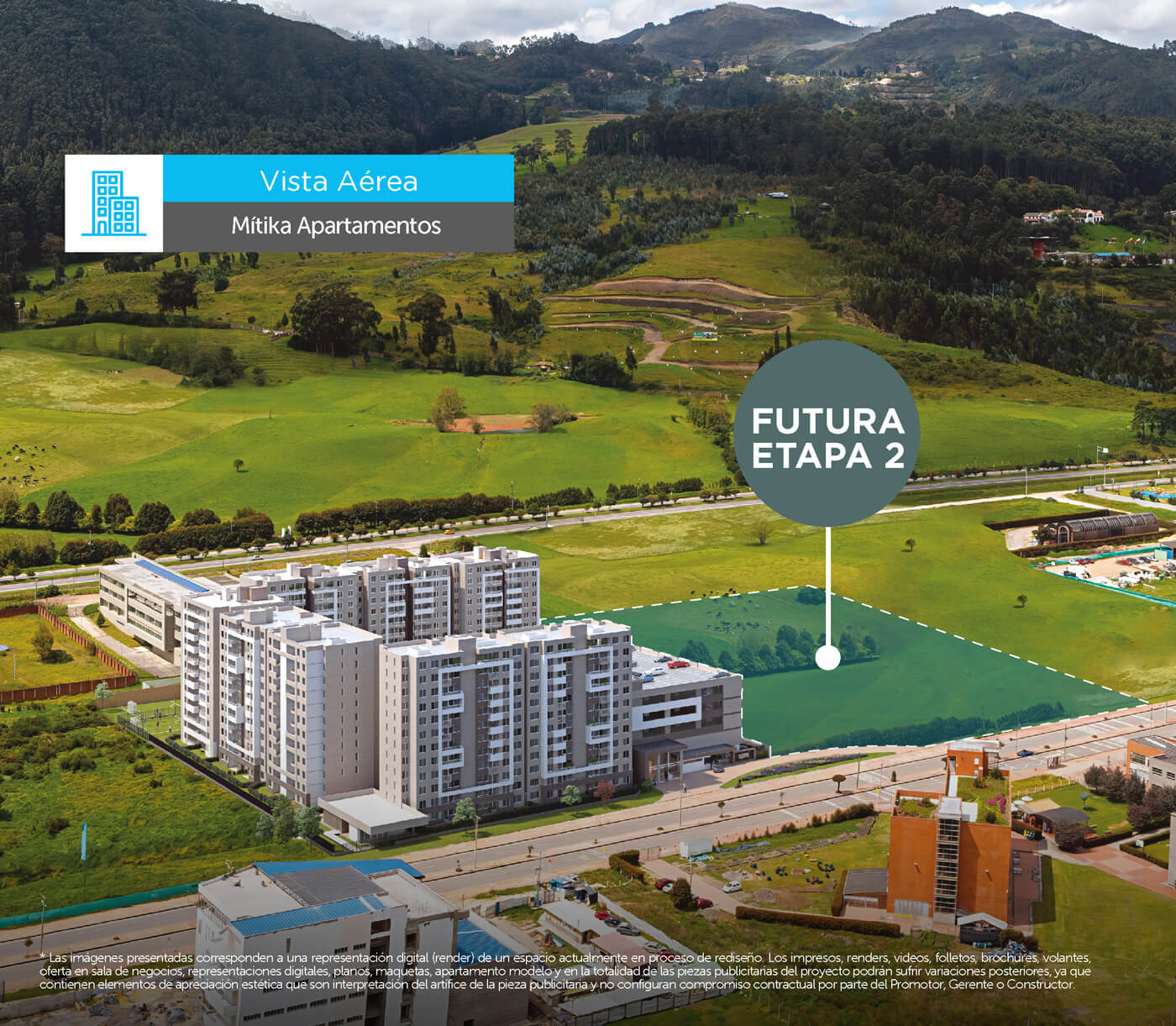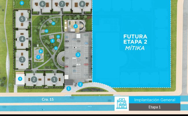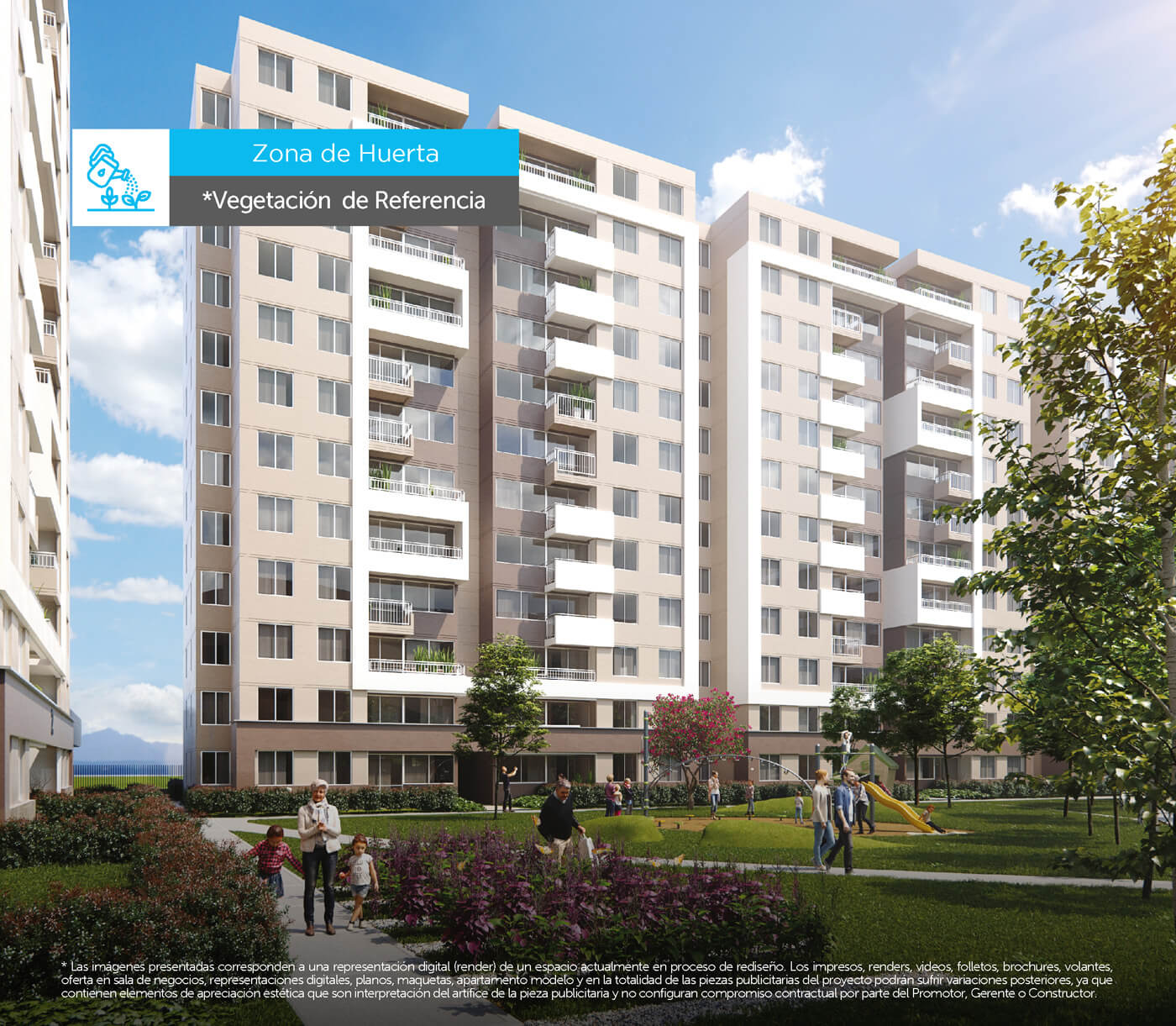 La primera etapa del proyecto cuenta 382 apartamentos distribuidos en 8 torres de 12 pisos cada una con ascensor, Club House, Play & Tech, Torre de parqueaderos, zona de mascotas y muchos más amenities para disfrutar en familia.